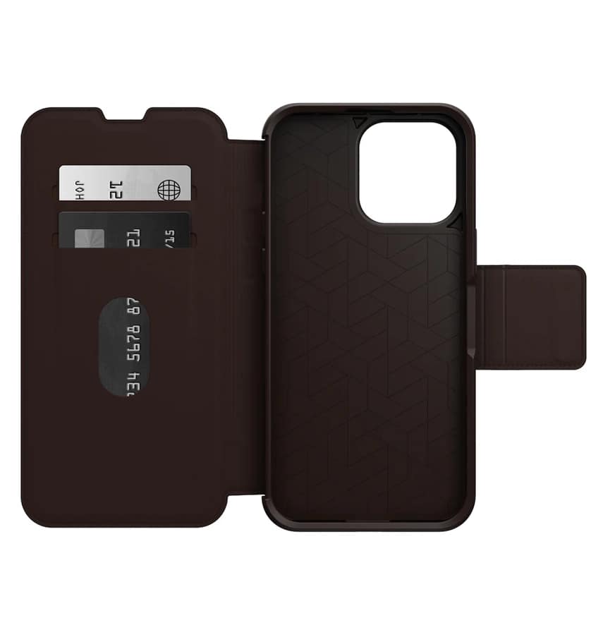 Protect your iPhone 14 Pro Max with the OtterBox Strada Series in Espresso – a premium slim, wallet-style case featuring drop protection, card slots, and a magnetic closure. Designed with both style and function in mind, it includes a convenient wallet compartment, offering everyday convenience and reliable protection in a sleek design.