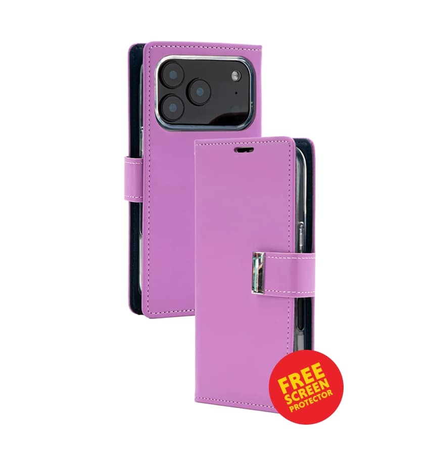 Protect your iPhone 17 Pro with the Mercury Rich Diary Series Purple/Navy case. Premium PU leather, MagSafe support, dual-tone design, card slots, and magnetic closure combine style.